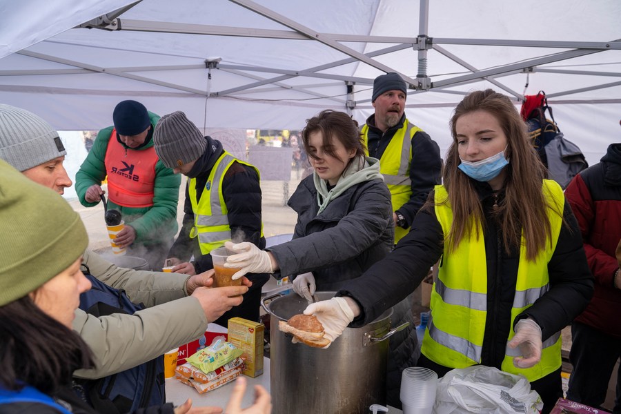 Charity staff members deliver free food on the plaza of the Lviv railway station in Lviv, Ukraine, March 9, 2022. (Xinhua/Ren Ke)