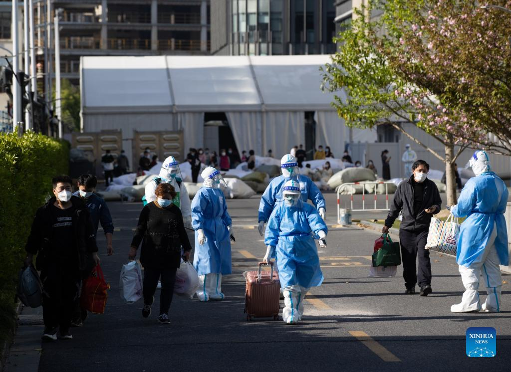 Patients who have recovered from COVID-19 leave a makeshift hospital converted from Shanghai Convention & Exhibition Center of International Sourcing in Shanghai, east China, April 9, 2022. The first group of 16 recovered COVID-19 patients left the makeshift hospital on Saturday. (Xinhua/Jin Liwang)
