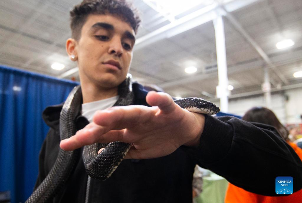 A man poses for photos with a snake during the 2022 Spring Canadian Pet Expo in Mississauga, the Greater Toronto Area, Canada, on April 15, 2022. Featuring a pet market, competitions, photo booths and more, the annual event is held here from Friday to Sunday. (Photo by Zou Zheng/Xinhua)