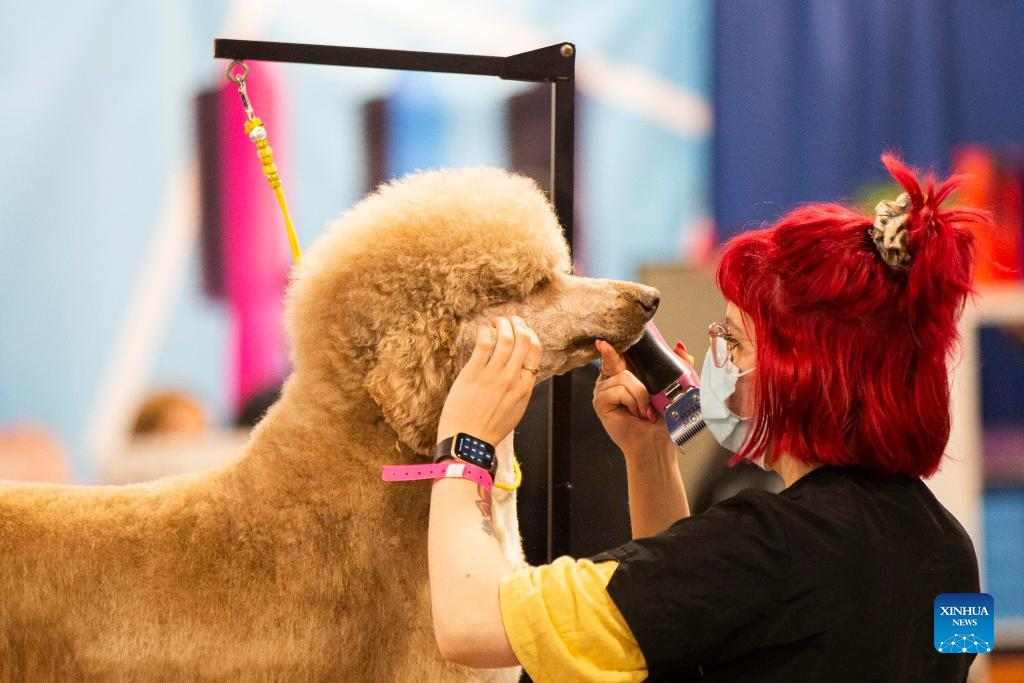 A pet groomer works on a pet dog during the 2022 Spring Canadian Pet Expo in Mississauga, the Greater Toronto Area, Canada, on April 15, 2022. Featuring a pet market, competitions, photo booths and more, the annual event is held here from Friday to Sunday. (Photo by Zou Zheng/Xinhua)