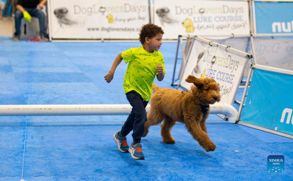 A boy runs with a pet dog during the 2022 Spring Canadian Pet Expo in Mississauga, the Greater Toronto Area, Canada, on April 15, 2022. Featuring a pet market, competitions, photo booths and more, the annual event is held here from Friday to Sunday. (Photo by Zou Zheng/Xinhua)