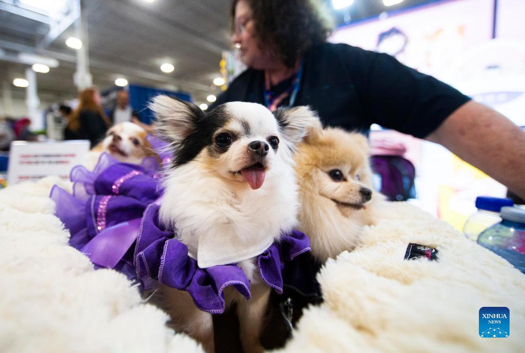 Dressed-up pet dogs are seen during the 2022 Spring Canadian Pet Expo in Mississauga, the Greater Toronto Area, Canada, on April 15, 2022. Featuring a pet market, competitions, photo booths and more, the annual event is held here from Friday to Sunday. (Photo by Zou Zheng/Xinhua)