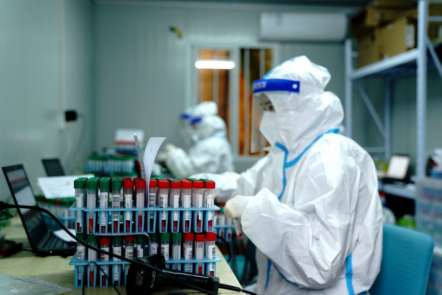 Medical workers work in a COVID-19 testing lab in east China's Shanghai, April 15, 2022. (Xinhua/Zhang Jiansong)