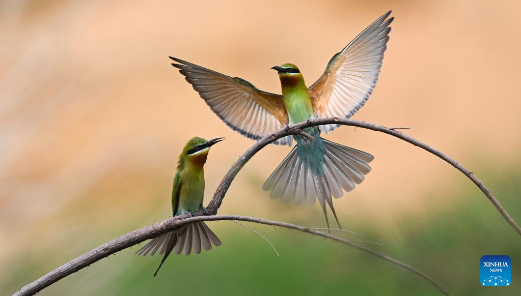 Blue-tailed bee eaters are seen in Haikou, south China's Hainan Province, April 16, 2022. Local authorities of Haikou have made full preparations for bee eaters to build a better habitat during their breeding season. (Xinhua/Yang Guanyu)