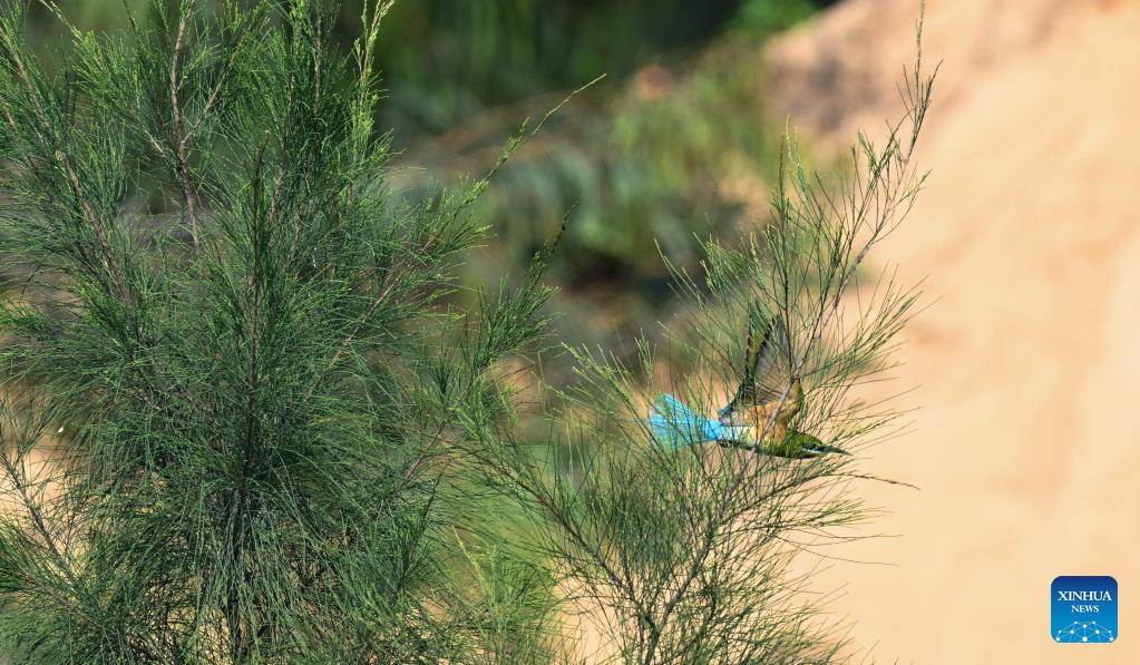 A Blue-tailed bee eater is seen in Haikou, south China's Hainan Province, April 9, 2022. Local authorities of Haikou have made full preparations for bee eaters to build a better habitat during their breeding season. (Xinhua/Yang Guanyu)