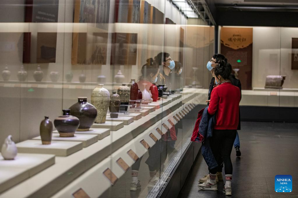 People visit an exhibition in Chongqing China Three Gorges Museum in southwest China's Chongqing, April 17, 2022. The exhibition displays precious cultural relics including bronze wares, ceramics, furniture and murals of the dynasties of Liao (907-1125), Jin (1115-1234), and Yuan (1271-1368). (Xinhua/Huang Wei)