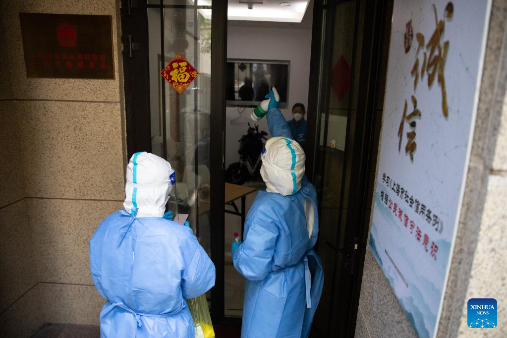 Medical workers disinfect the building where they took swab samples from residents for nucleic acid testing at the Guangfu residential area in Yuyuan sub-district in Shanghai, east China, April 16, 2022. Medical workers conducted nucleic acid tests on those who tested positive via the antigen screening on Saturday in the Guangfu residential area. (Xinhua/Jin Liwang)