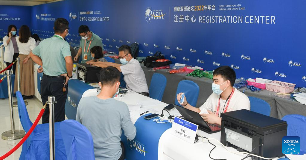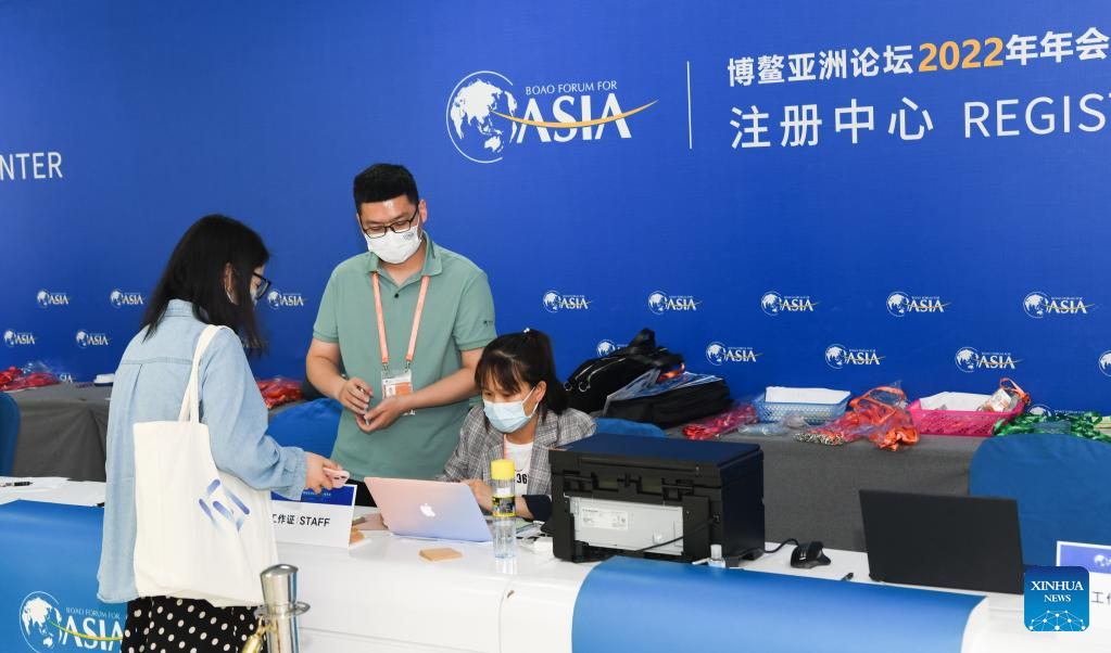 Staff members work at the registration center of the Boao Forum for Asia in Boao, south China's Hainan Province, April 18, 2022. The Boao Forum for Asia (BFA) will hold its annual conference from April 20 to 22 in Boao, a coastal town in China's southernmost province of Hainan. (Xinhua/Yang Guanyu)