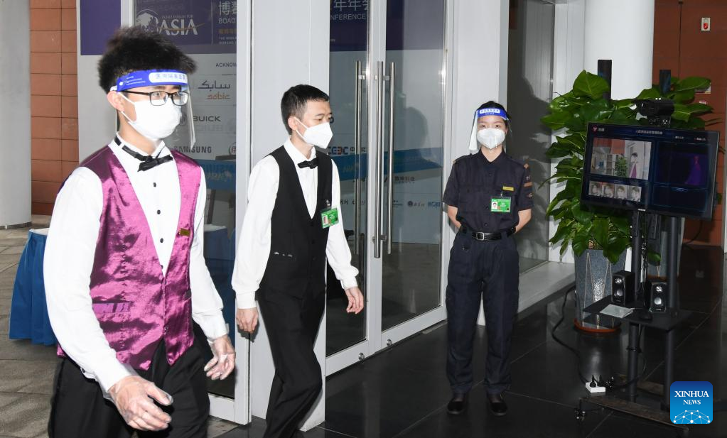 A body temperature screening system is used to check temperature of staff members at the media center of the Boao Forum for Asia in Boao, south China's Hainan Province, April 18, 2022. The Boao Forum for Asia (BFA) will hold its annual conference from April 20 to 22 in Boao, a coastal town in China's southernmost province of Hainan. (Xinhua/Yang Guanyu)