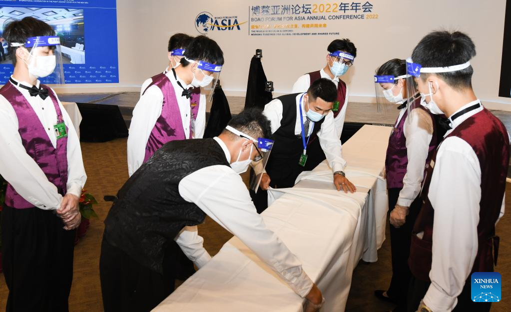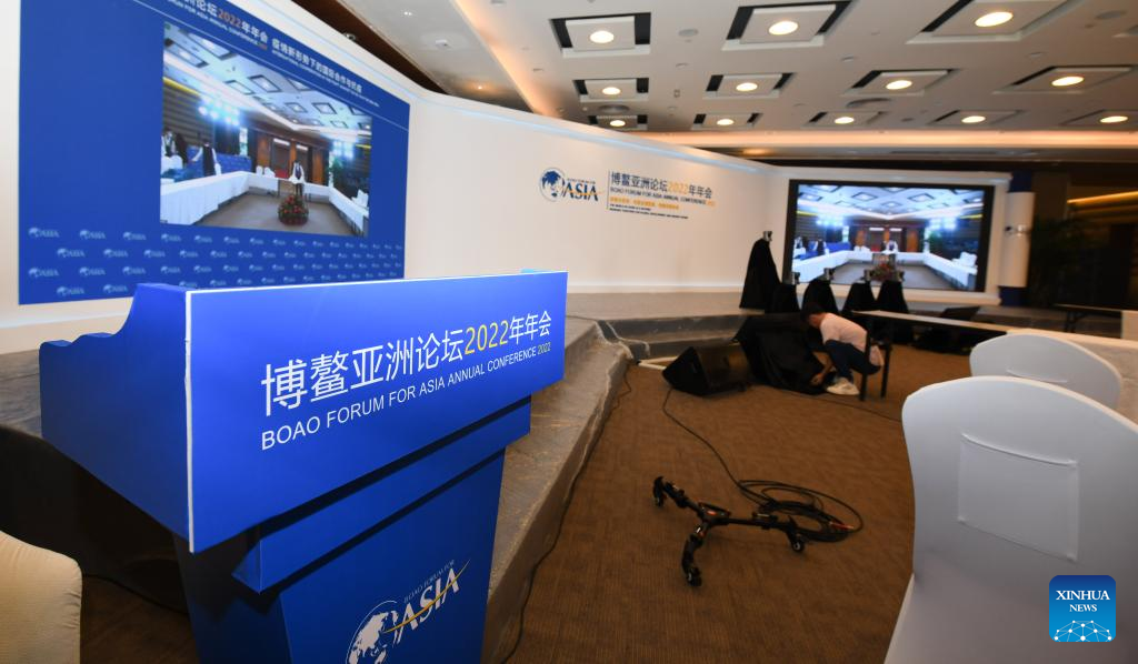 Staff members work at the venue of the Boao Forum for Asia in Boao, south China's Hainan Province, April 18, 2022. The Boao Forum for Asia (BFA) will hold its annual conference from April 20 to 22 in Boao, a coastal town in China's southernmost province of Hainan. (Xinhua/Yang Guanyu)