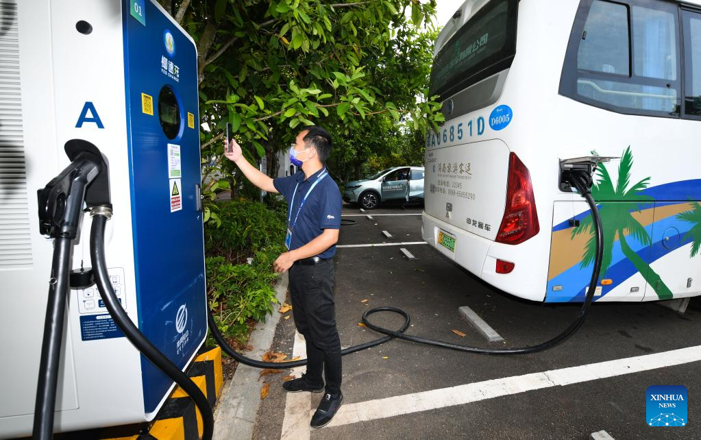 A staff member charges a bus near the venue of the Boao Forum for Asia in Boao, south China's Hainan Province, April 18, 2022. The Boao Forum for Asia (BFA) will hold its annual conference from April 20 to 22 in Boao, a coastal town in China's southernmost province of Hainan. (Xinhua/Yang Guanyu)