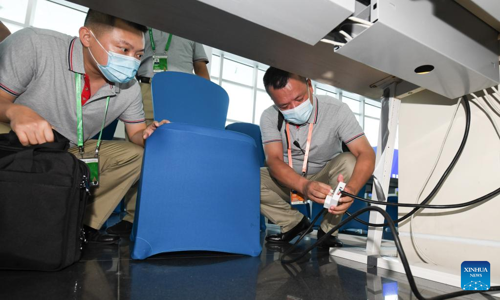 Staff members check the wires at the media center of the Boao Forum for Asia in Boao, south China's Hainan Province, April 18, 2022. The Boao Forum for Asia (BFA) will hold its annual conference from April 20 to 22 in Boao, a coastal town in China's southernmost province of Hainan. (Xinhua/Yang Guanyu)