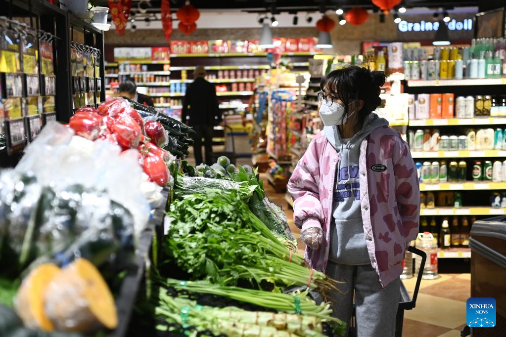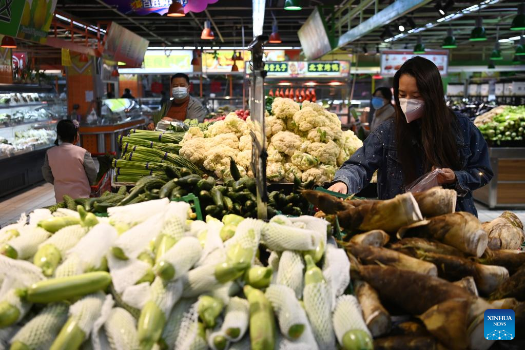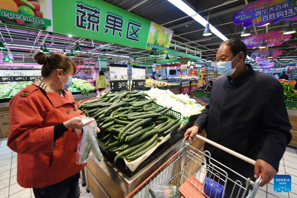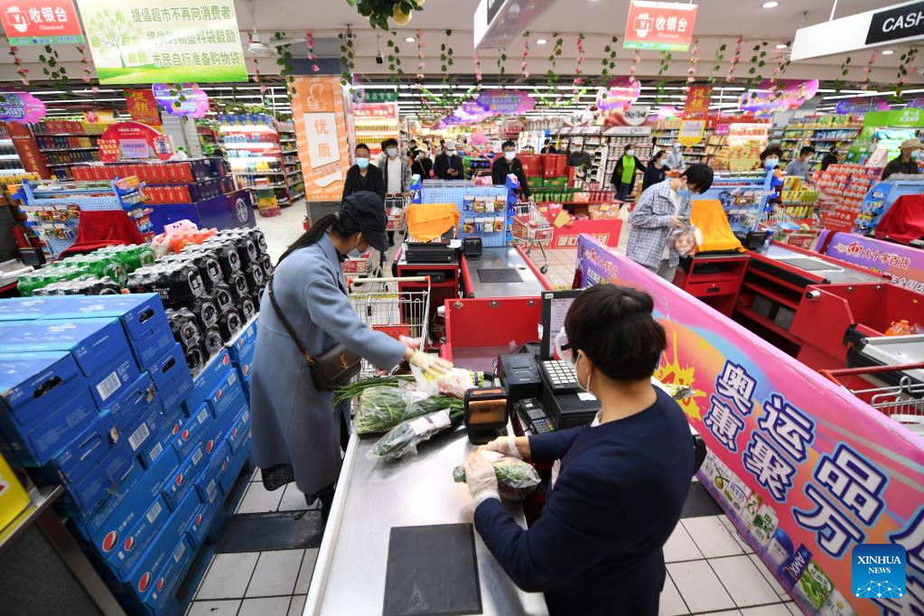 Citizens shop at a supermarket in Chengxi District of Xining City, northwest China's Qinghai Province, April 18, 2022. Local authorities have taken measures to ensure supplies and meanwhile they set up teams to purchase and distribute living supplies for residents in the controlled communities amid the latest resurgence of COVID-19 infections. (Xinhua/Fan Peishen)