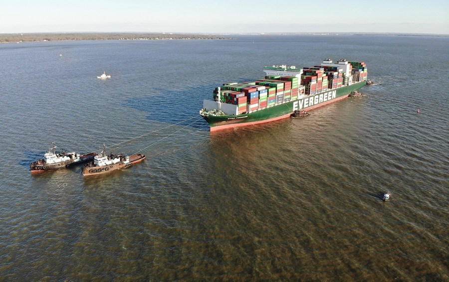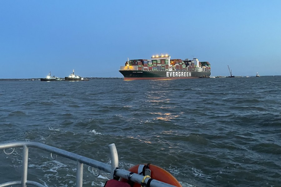 The U.S. Coast Guard, Maryland Department of the Environment and Evergreen Marine Corporation, in partnership with multiple state and local responders, refloat the Ever Forward in the Chesapeake Bay, the United States, April 17, 2022. (U.S. Coast Guard/Devin Erfourth/Handout via Xinhua)