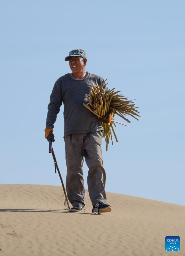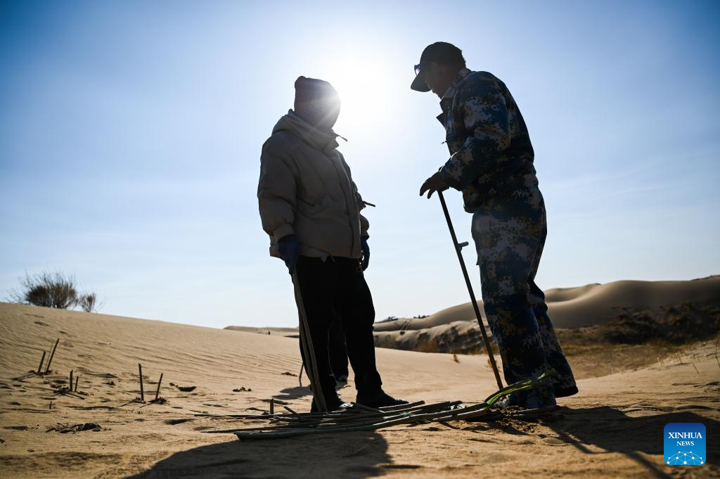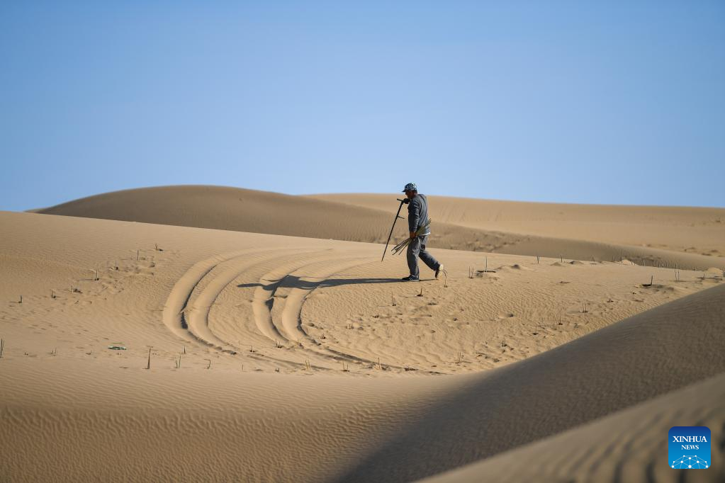 A worker prepares to plant salix at an eco-tourism area in Dalad Banner, north China's Inner Mongolia Autonomous Region, April 18, 2022. (Xinhua/Liu Lei)