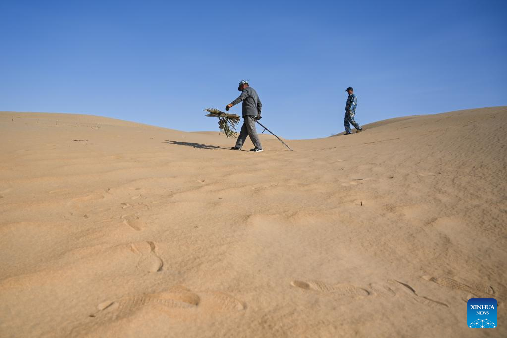 A worker transfers salix saplings at an eco-tourism area in Dalad Banner, north China's Inner Mongolia Autonomous Region, April 18, 2022. (Xinhua/Wang Zecong)