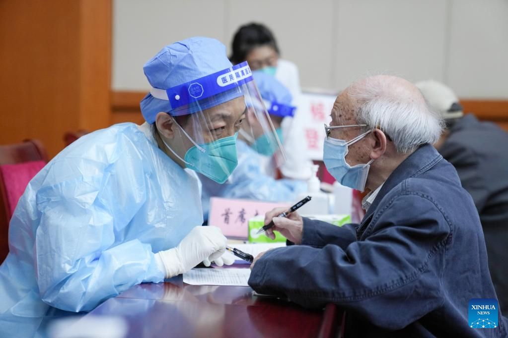 A medical worker injects COVID-19 vaccine for a senior citizen in Dongcheng District of Beijing, capital of China, April 18, 2022. Dongcheng District set exclusive venues for senior citizens to get COVID-19 vaccines. (Xinhua/Ju Huanzong)