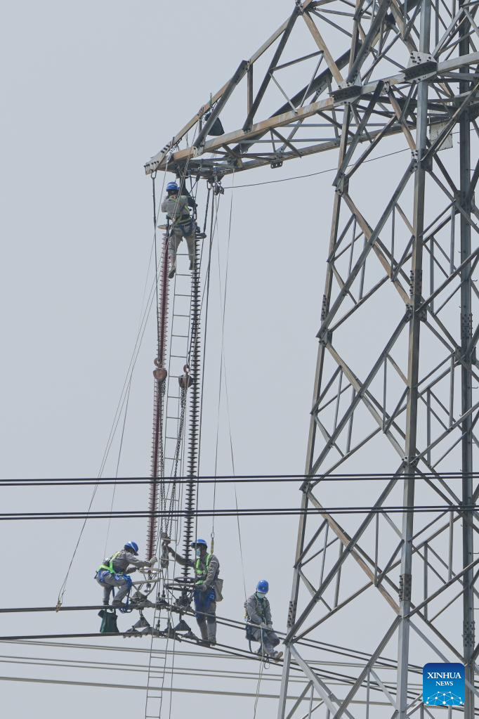 Workers maintain the "Longquan-Zhengping" 500-kilovolt direct current transmission project in Lujiang County of Hefei, east China's Anhui Province, April 19, 2022. (Xinhua/Du Yu)