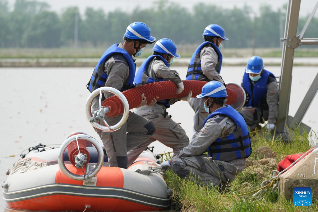 Workers maintain the "Longquan-Zhengping" 500-kilovolt direct current transmission project in Lujiang County of Hefei, east China's Anhui Province, April 19, 2022.(Xinhua/Du Yu)