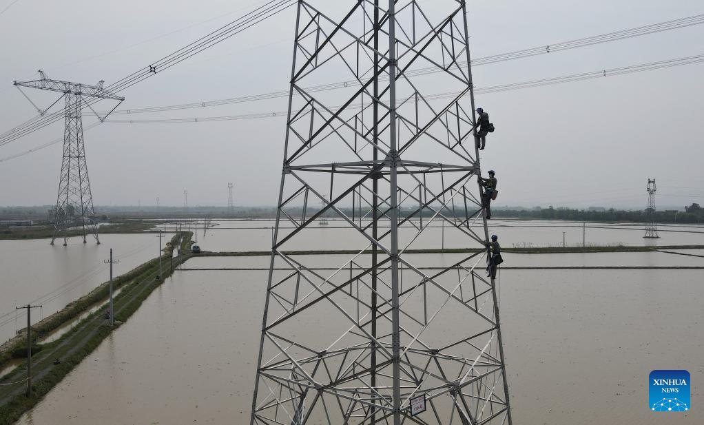 Aerial photo taken on April 19, 2022 shows workers climbing the power transmission tower to maintain the "Longquan-Zhengping" 500-kilovolt direct current transmission project in Lujiang County of Hefei, east China's Anhui Province.(Xinhua/Zhou Mu)