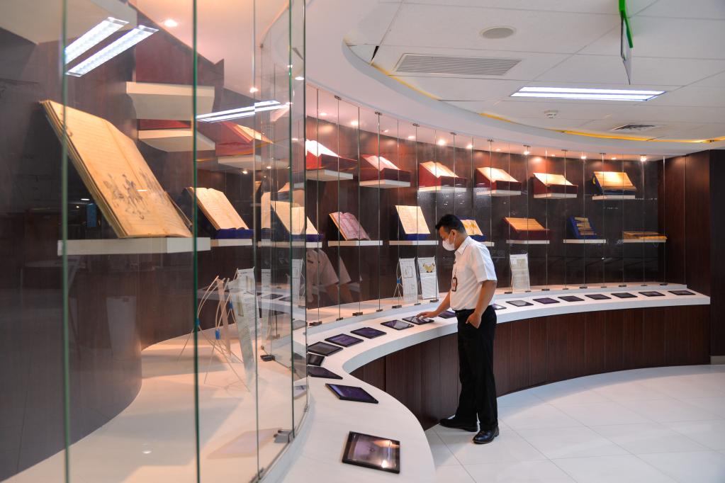 A staff member checks manuscripts at a showroom of the National Library in Jakarta, Indonesia, April 19, 2022. The National Library of Indonesia has the most comprehensive collection of publications in Indonesia. The manuscripts written on leaves, bark, bamboo and Indonesian native paper record the history, culture and information of Indonesia in various eras. (Xinhua/Xu Qin)