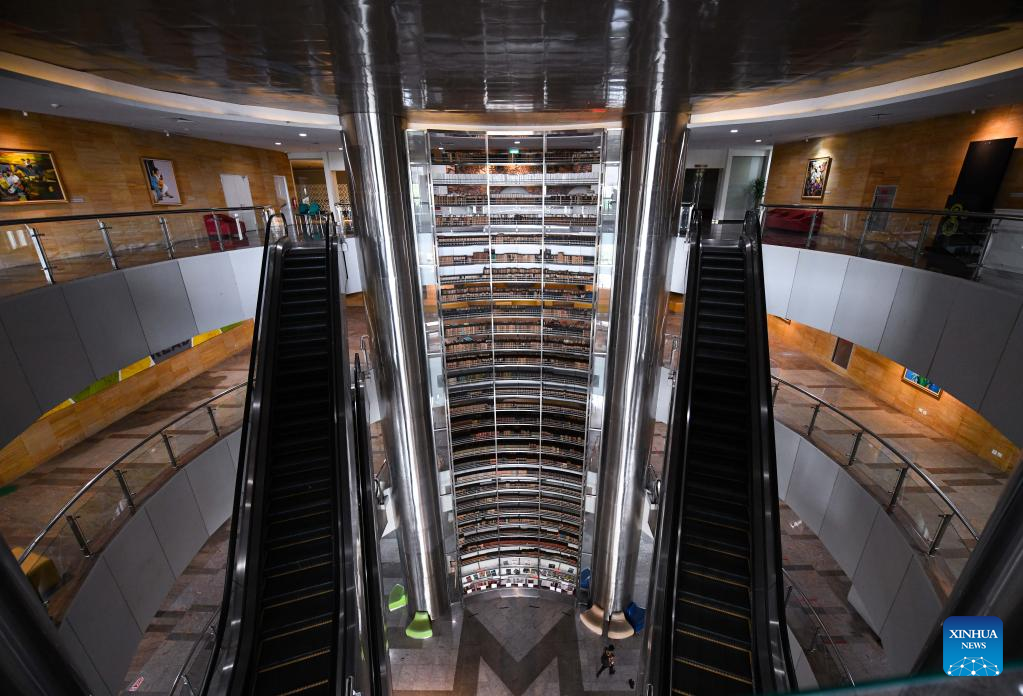 Photo taken on April 19, 2022 shows a four-story bookcase at the National Library in Jakarta, Indonesia. The National Library of Indonesia has the most comprehensive collection of publications in Indonesia. The manuscripts written on leaves, bark, bamboo and Indonesian native paper record the history, culture and information of Indonesia in various eras. (Xinhua/Xu Qin)