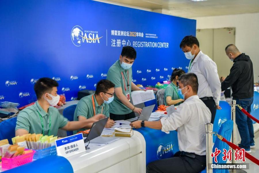 Journalists register at the reception area at the media center of Boao Forum for Asia annual conference in Boao, south China's Hainan Province, April 19, 2022. (Photo: China News Service/Luo Yunfei)
