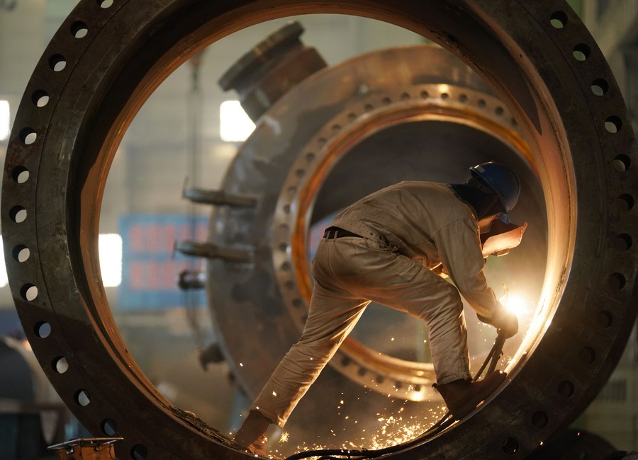 A worker works at a factory of Harbin Boiler Company Ltd. of Harbin Electric Corporation in Harbin, northeast China's Heilongjiang Province, on April 14, 2022. (Xinhua/Wang Jianwei)