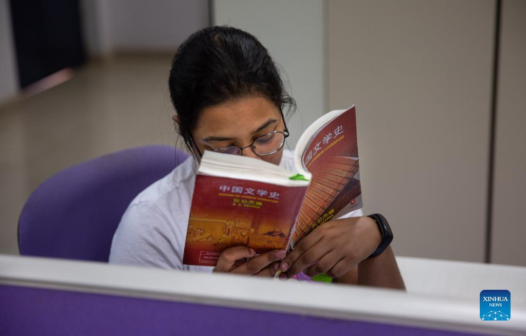 An Indian student of Chinese language course reads a book on Chinese literature in a library of the Center for Chinese and South East Asian Studies at Jawaharlal Nehru University (JNU) on the United Nations Chinese Language Day, in New Delhi, India, April 20, 2022. The UN Chinese Language Day is observed on April 20 every year since 2010, celebrating the language's contribution to the world while encouraging more people to learn it. (Photo by Javed Dar/Xinhua)