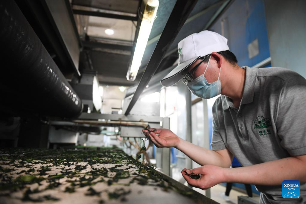A worker works at a tea workshop in Shaoxing, east China's Zhejiang Province, April 20, 2022. Spring tea harvest season has started at a matcha producing base in Fusheng Township of Shaoxing.