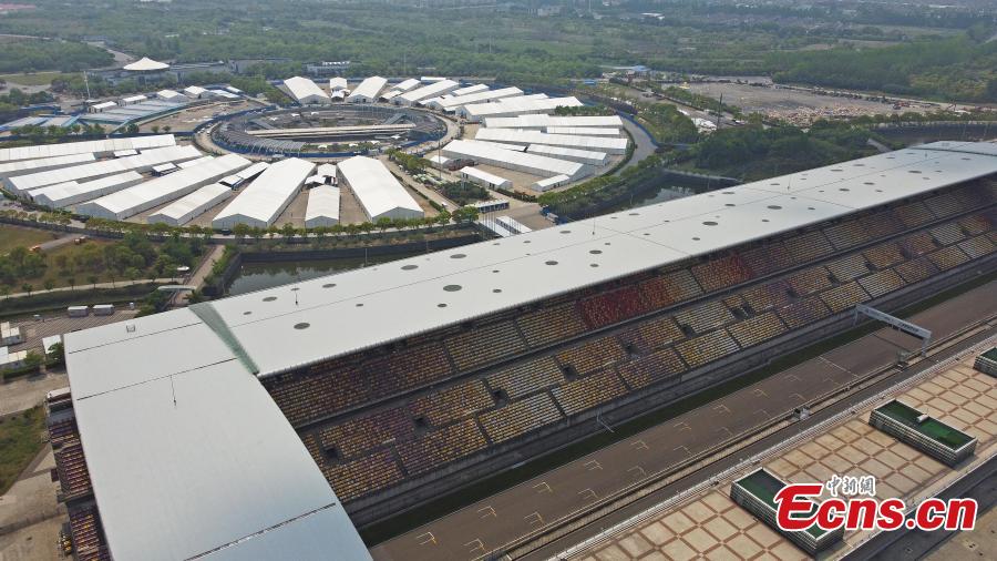 Aerial view photo shows a makeshift hospital converted from the Shanghai International Circuit to aid the fight against resurging COVID-19 in east China's Shanghai, April 20, 2022. Located at Jiading district, the hospital has a capacity of 14,000 beds. (Photo: China News Service/Yin Liqin)