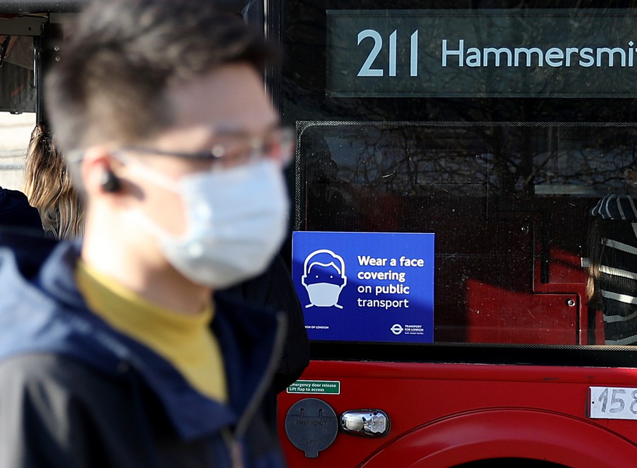 A man walks past a bus with a notice requiring people to wear face coverings in London, Britain, March 27, 2022. (Xinhua/Li Ying)