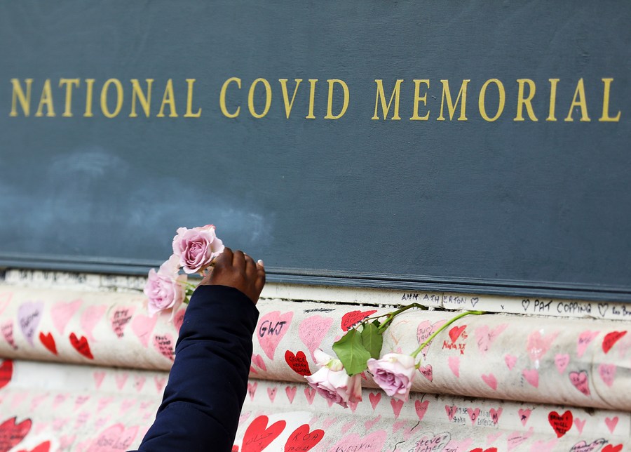 A woman puts a flower on the National COVID Memorial Wall in London, Britain, March 27, 2022. (Xinhua/Li Ying)