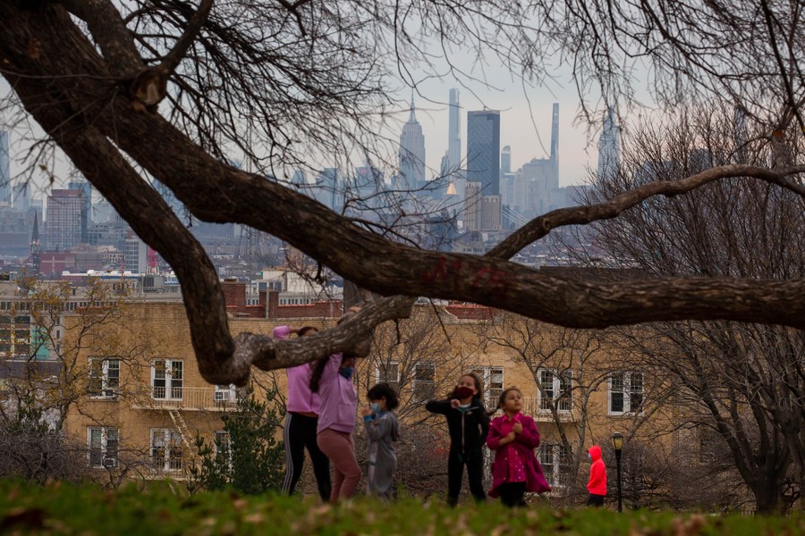 Children play under a tree at Sunset Park in the Brooklyn borough of New York, the United States, on Nov. 21, 2020. (Photo by Michael Nagle/Xinhua)