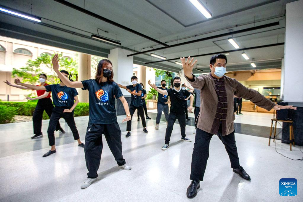 Ekarat Janrathitikarn (1st R), Thai dean of the Maritime Silk Road Confucius Institute, teaches Chinese Tai Chi during a class at Dhurakij Pundit University in Bangkok, Thailand, April 21, 2022. A one-month Tai Chi course is held by Maritime Silk Road Confucius Institute in Dhurakij Pundit University, which attracts more than 40 students to take part in. (Xinhua/Wang Teng)
