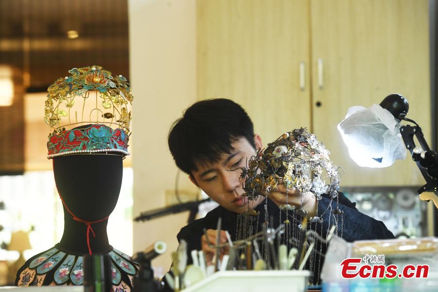 Gu Guoqiang, a post-90s young man makes ornaments with filigree inlay techniques in Chongqing, April 21, 2022. (Photo: China News Service/Chen Chao)