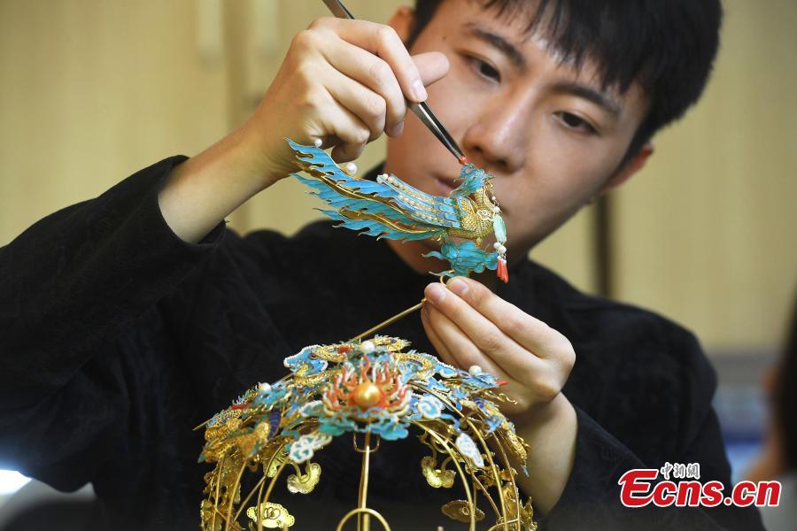 Gu Guoqiang, a post-90s young man makes ornaments with filigree inlay techniques in Chongqing, April 21, 2022. (Photo: China News Service/Chen Chao)