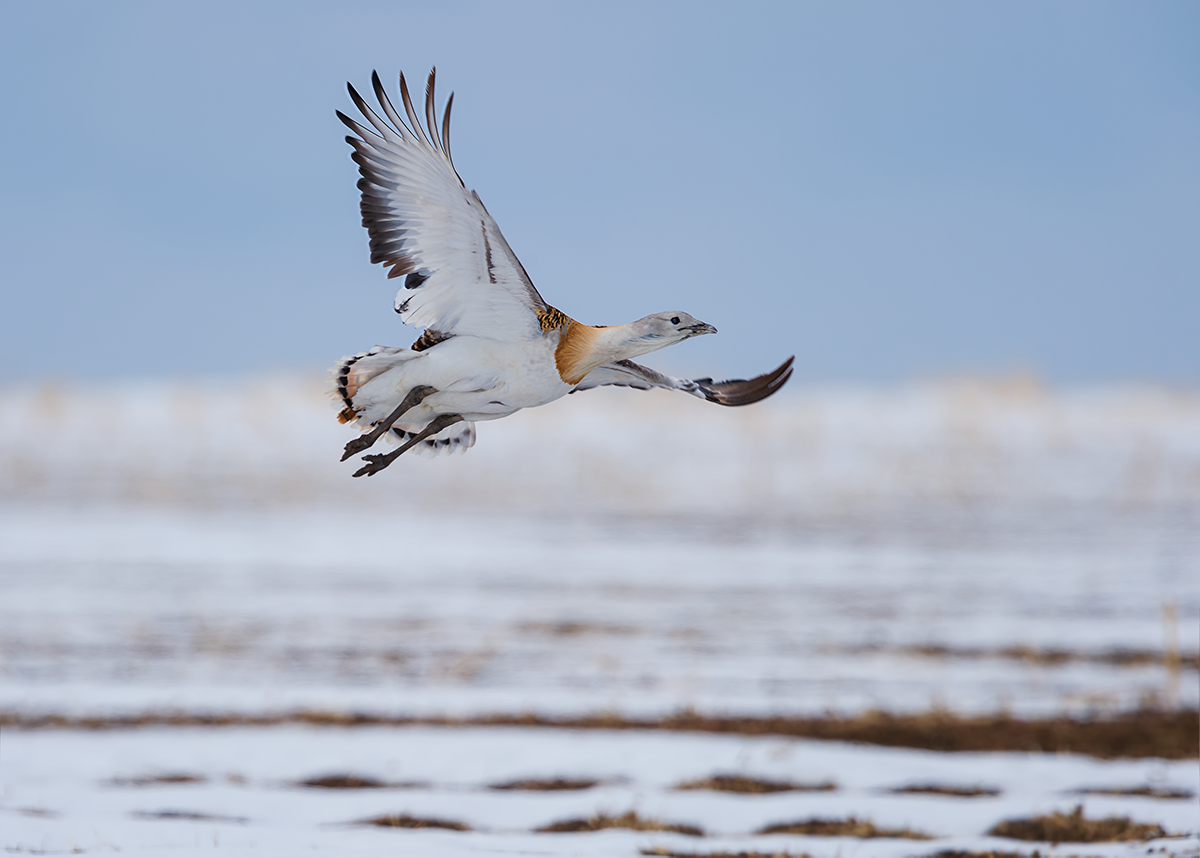 A great bustard flies over the Tumuji National Nature Reserve in north China's Inner Mongolia Autonomous Region. (Photo/szb.northnews.cn)