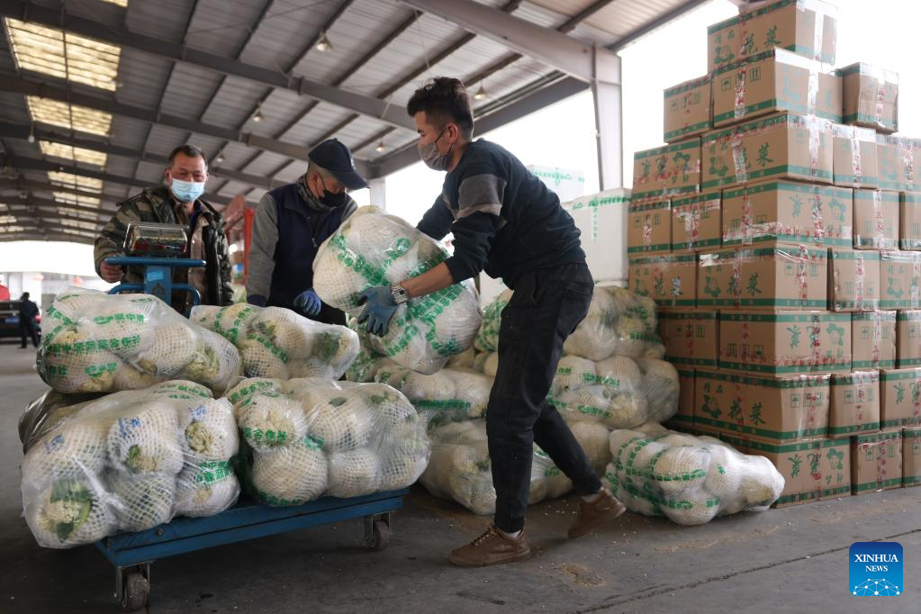 Vendors weigh vegetables at an agricultural products distribution center in Xining, northwest China's Qinghai Province, April 23, 2022.