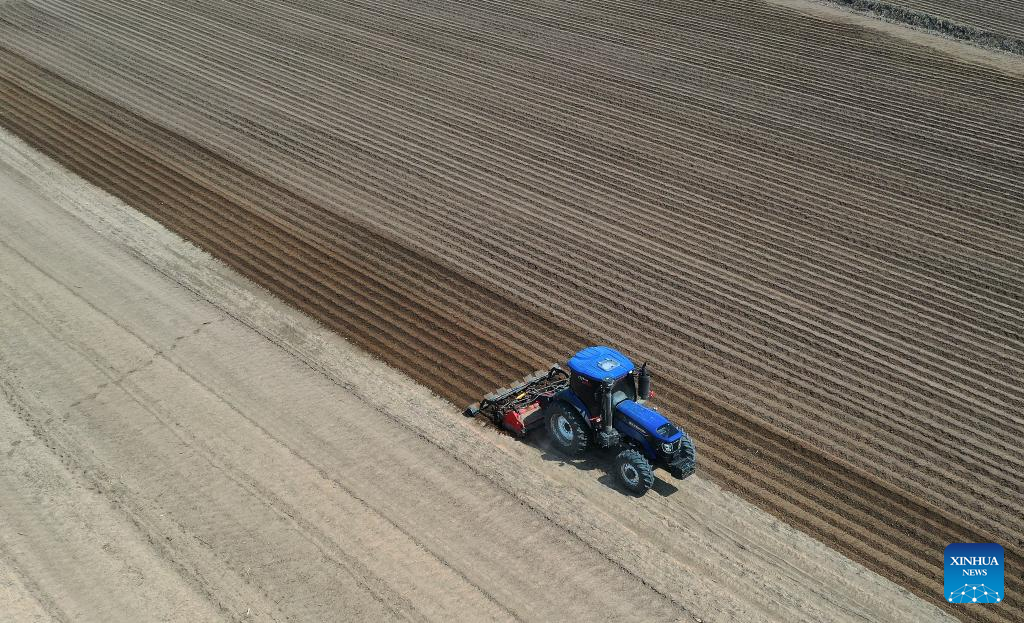 Aerial photo taken on April 22, 2022 shows a tractor ploughing at a soybean farm in Shisijiazi Village of Daniu Township in Tai'an County, northeast China's Liaoning Province. (Photo by Liu Ming/Xinhua)