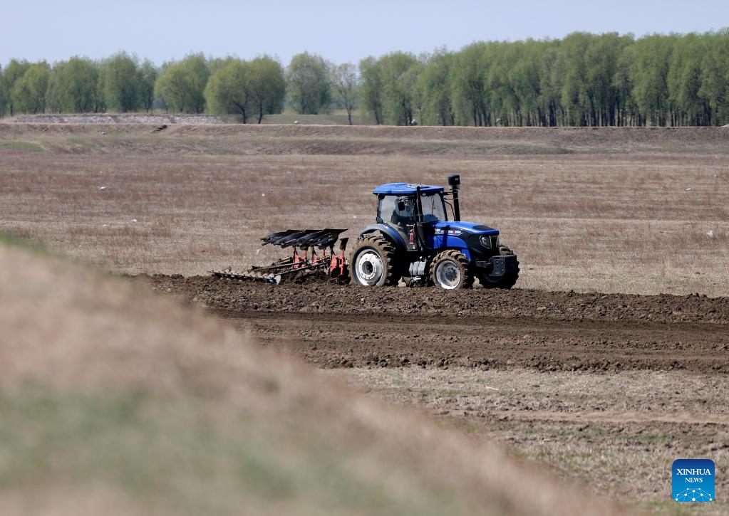 A tractor ploughs at a soybean farm in Shisijiazi Village of Daniu Township in Tai'an County, northeast China's Liaoning Province, April 22, 2022. (Xinhua/Yao Jianfeng)