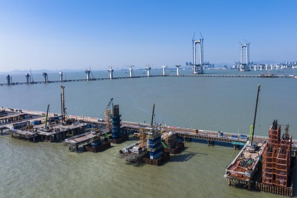 The Shenzhen–Zhongshan Bridge to the south of Wangqingsha township, Nansha district, Guangzhou is under construction, April 3, 2022. It is another super structure after the Hong Kong-Zhuhai-Macao Bridge, and is expected to open to traffic in 2024. (People's Daily Online/Wei Jinsong)