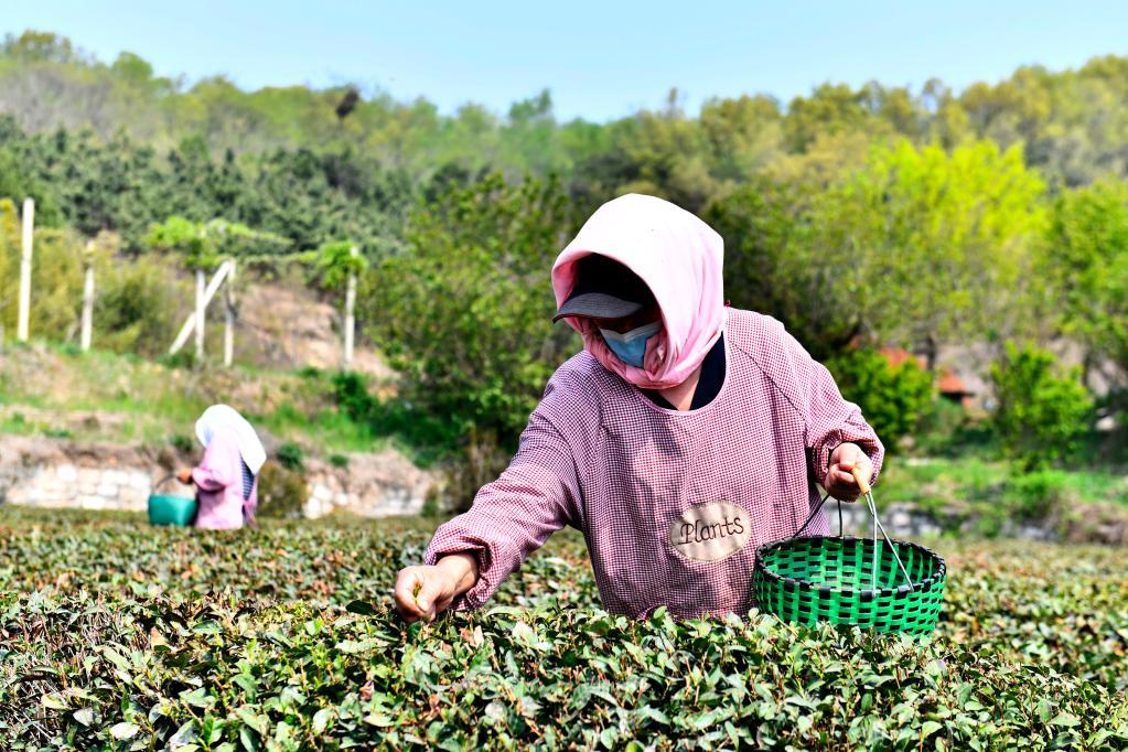 Photo taken on April 21, 2022 shows tea farmers picking spring tea at a tea plantation in Donggang District of Rizhao City, east China's Shandong Province. The harvest season of spring tea has started in Rizhao. The tea industry helps increase local villagers' income and promote rural revitalization. (Xinhua/Guo Xulei)