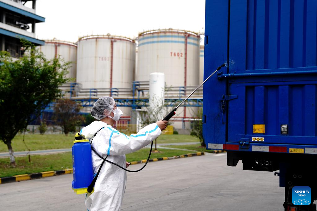 A staff member disinfects a truck transporting edible oil products of Shanghai Kerry Food Industries Co., Ltd. in Shanghai, east China, April 22, 2022. (Xinhua/Zhang Jiansong)
