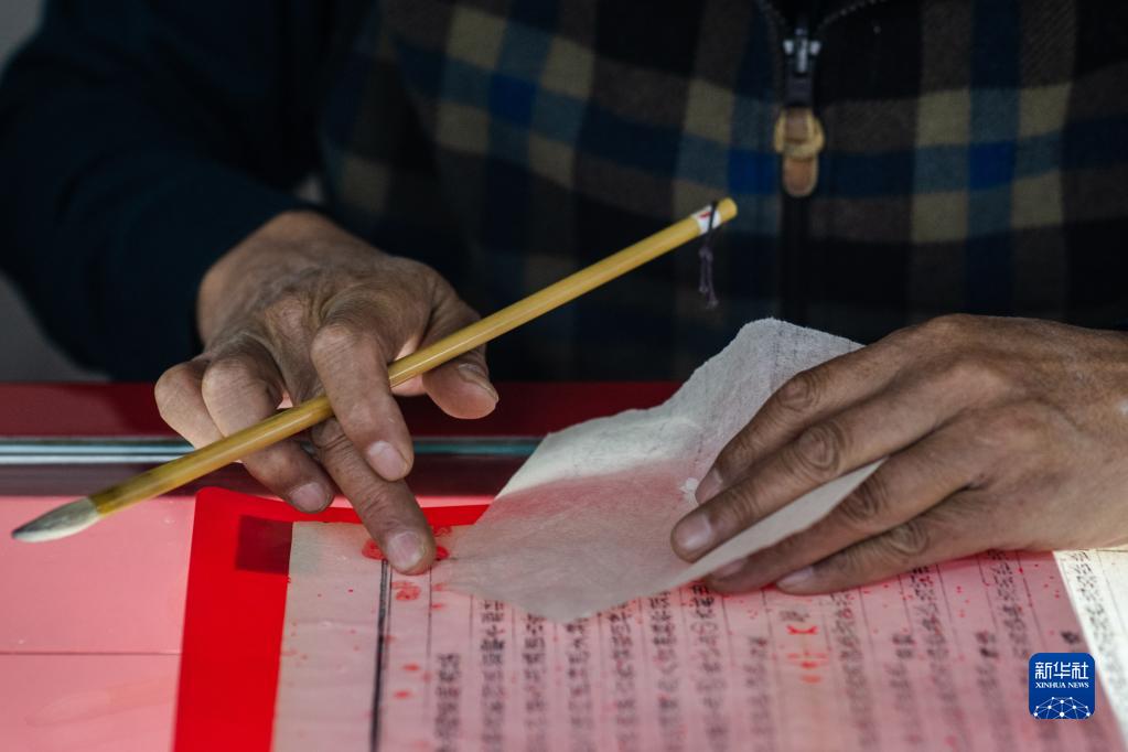 Photo shows Yang repairing an ancient book. (Xinhua/Hu Chao)