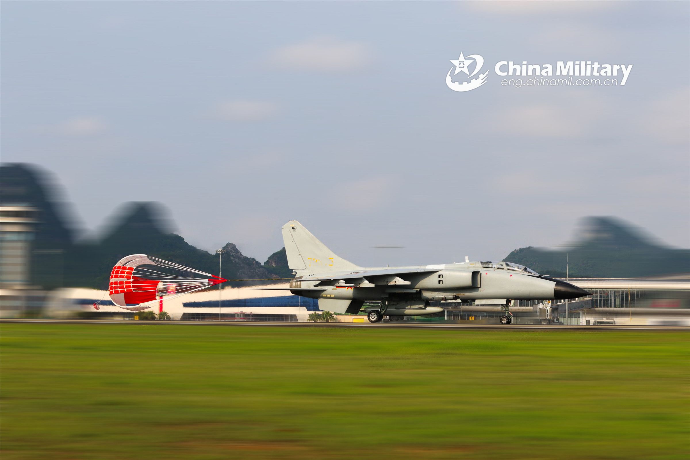 A fighter jet attached to an aviation brigade with the air force under the PLA Southern Theater Command decelerates with the help of its drag parachute after a flight training exercise on March 25, 2022. (eng.chinamil.com.cn/Photo by Xu Jingcheng)