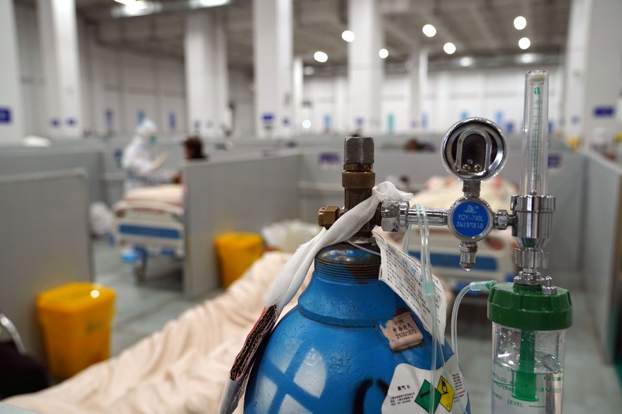 Photo taken on April 23, 2022 shows an oxygen tank in a makeshift hospital in Shanghai. (Xinhua/Yang Youzong)