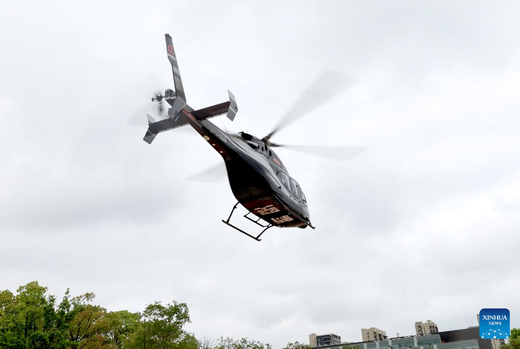 A helicopter takes off from Songjiang District in Shanghai, east China, April 24, 2022. A helicopter company in Shanghai offered free service to transport medical articles to help the city fight against COVID-19. (Xinhua/Chen Jianli)