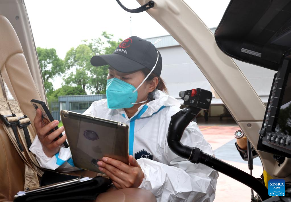 Captain Wang Ling conducts a check before taking off from Songjiang District in Shanghai, east China, April 24, 2022. A helicopter company in Shanghai offered free service to transport medical articles to help the city fight against COVID-19. (Xinhua/Chen Jianli)