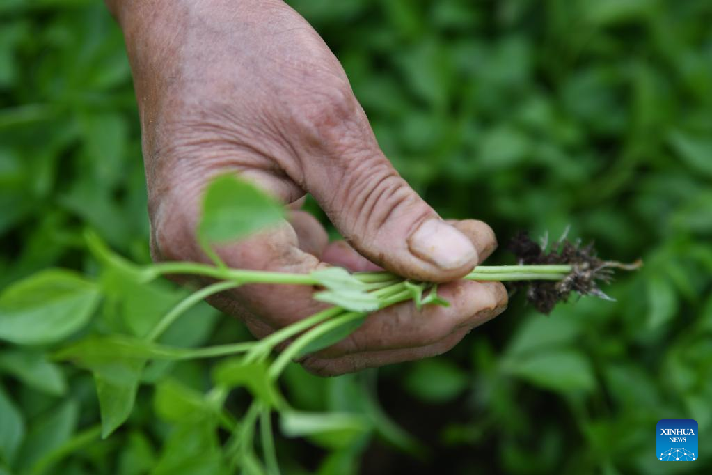 A villager checks the growth of crops in a field in Rulin Town of Chengbu Miao Autonomous County in Shaoyang, central China's Hunan Province, April 24, 2022. (Photo by Yan Qinlong/Xinhua)